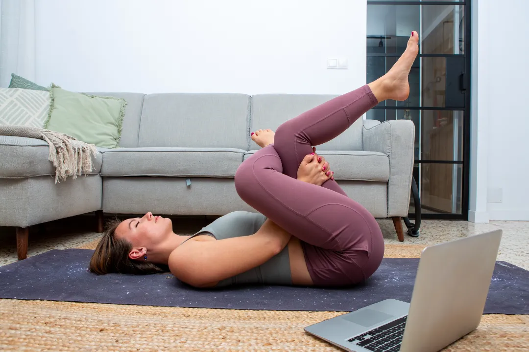 仰向けでストレッチしている女性